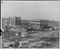 The construction contract was awarded to the George A. Fuller Company, with the Catalytic Construction Company acting as engineer/architects. To expedite the process Fuller was instructed to commence when the design reached the 70% complete stage. Ground was broken in May 1951. The production area encompassed 136 acres (55 ha), of which 19 acres (7.7 ha) was under cover.[18] Works included moving 2,600,000 cubic yards (2,000,000 m3) of earth,[19] laying 4 miles (6.4 km) of railroad tracks and building 24 acres (9.7 ha) of paved roads and storage areas.[18]