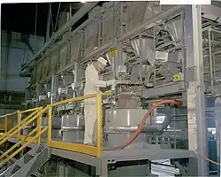 The production process at the Fernald Feed Materials Production Center began at Plant 1, also known as the Sampling Plant. The principal function of the Sampling Plant was to weigh, sample, classify and sort representative samples of the large quantities of incoming ore concentrates. Ore suppliers were paid based on the ore's uranium content.[24][25] The Sampling Plant had over 19,045 square metres (205,000 sq ft) of storage space, of which 3,879 square metres (41,750 sq ft) was under cover.[26]