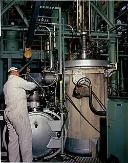 Plant 5, the Metals Production Plant, was where green salt was converted into metal. The conversion of UF to metal was accomplished by the thermite reduction of green salt with magnesium in a steel-lined reaction vessel known as a "bomb".[36] Green salt was mixed with magnesium granules and packed in the reaction pot, which was lined with magnesium fluoride slag and capped with slag. The pot was heated to 649 to 816 °C (1,200 to 1,501 °F) in a furnace. After about four hours a thermite-type reduction reaction occurs:[37]