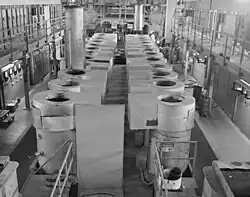 Plant 6 was known as the Metals Fabrication Plant. Ingots from Plants 5 and 9 were heat treated in salt water baths and quenched with oil to give them extra strength. The salt film inhibited oxidation of the surface metal. The process was devised by researchers at the AEC's Argonne National Laboratory who investigated how to protect the uranium from cracking during the rolling process.[38][39]