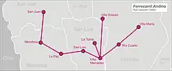 The Andean Railway (native name: Ferrocarril Andino) was a state-owned railway company in Argentina which, towards the end of the 19th century, built and operated a line connecting Villa María in Córdoba Province with the cities of Mendoza, San Luis and San Juan. The 1,676 mm (5 ft 6 in) network was later sold to a number of British-owned railway companies.