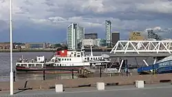 "Mersey" refers to the River Mersey in northwest England, which flows into the Irish Sea at Liverpool. The Mersey Ferry runs between Liverpool and Birkenhead and Seacombe on the Wirral Peninsula.