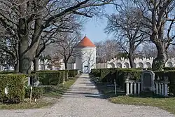 Feuerhalle Simmering's main building and its immediate surroundings were planned by Clemens Holzmeister, who designed the crematorium to resemble an oriental fortress.[1] Holzmeister's design carefully placed the crematorium into the walled gardens of the derelict Schloss Neugebäude, and thus also put the former palace gardens with its many ancient trees (designated natural monuments) to new use as urn burial ground.