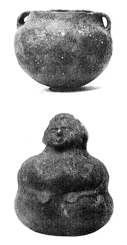 Mound No. 2 is located on the western side of the plaza. It is 235 feet (72 m) across from north to south, and 160 feet (49 m) across east to west. At the time of excavation it reached 7.5 feet (2.3 m) high.[5] Less than one-fifth of the area of the mound was excavated; because of this, it is impossible to know the number of structures constructed upon it. The mound was raised in four stages. The first level, at the base of the mound, was the original ground surface of the soil. In this layer, archaeologists discovered a fire bed filled with ashes and broken animal bones, indicating that a structure had existed there before the mound was built over top of it.[5] After the house was torn down, the 3 feet (0.91 m) high mound was constructed in its place. On the second level there is evidence that at least one building, and probably more, were constructed. The floor of this structure was packed down and layered with stone slabs, much like pavement. A small pile of maize and maize meal were also found. In the southwestern segment of the mound were found the ruins of a structure, named by Myer the "Sacred Image House" because among the items found were the remains of a sacred idol, a shrine, and traces of fire ceremonies.[5] After the buildings were torn down the mound was raised a few more inches for the third construction level. Many items were found on this level, such as a metate and muller, arrowheads, shell tempered pottery, multiple fire beds, and objects made from deer bones. However, the most important was a structure dubbed the "House of Mysteries".[5] The building was an important civic structure, probably used for sacred rites and town gatherings, and had two rooms. Myers described the floor as being made of "black, glossy earth".[5] The walls and roof of the building were built using the cane matting technique and an arched roof. The woven cane matting was then covered inside and outside with a coating of clay plaster known as wattle and daub. Inside the building was an altar, complete with an oval altar bowl. The bowl, filled with white, powdery ashes, was made of fired red clay. The fire was allowed to burn without being put out. The structure was eventually destroyed by fire.[5] Mound No. 2 was in constant cultivation for at least 85 years, and as a result, only limited structural evidence exists for the final stage. However, numerous postholes indicate that there was a building constructed atop the mound during this phase. It is also important to note that a few burials from the later group of rectangular stone grave people were found close to the surface of Mound No. 2. These were discovered in 1895, when the farmer who owned the land plowed over them and decided to take a closer look.[5]