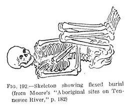 Two different groups of people lived at the Fewkes Site. The first group, who built the mounds and left the majority of artifacts, buried their dead with their bodies tightly flexed in hexagonal and circular stone box graves. This was probably achieved by tightly binding the body after death, because the bones appear to be in their proper places.[5] These people appear to have lived in circular houses. This occupation dates to the Mississippian period, between 1000 – 1450.[2] A second group moved into the area toward the end of the period. This group buried its dead with the bodies fully extended, on their backs, in rectangular stone box graves.[5] Archaeological research done within the Middle Cumberland River Valley marks a virtual abandonment of the area around 1450. It is unknown what caused this, but the large amount of broken pottery on the floors of their homes may indicate that they were forced to leave in a hurry.[5] This abandonment of the region is part of a larger pattern seen in parts of the Ohio, Mississippi, Tennessee, and Cumberland River valleys known as the "Vacant Quarter" hypothesis.[2] As of 2010, officials at the Tennessee Department of Environment and Conservation, Division of Archaeology, have been unable to identify modern tribal descendants of the inhabitants of the site.[2]