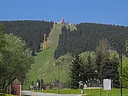 The Fichtelberg (German pronunciation: [ˈfɪçtl̩bɛʁk] ⓘ) is a mountain with two main peaks in the middle of the Ore Mountains in the east German state of Saxony, near the Czech border. At 1,214.6 m (3,985 ft) above sea level, the Fichtelberg is the highest mountain in Saxony, the second highest in the Ore Mountains and was formerly the highest mountain in East Germany. Its subpeak is 1,206 m (3,957 ft) high.