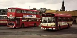 Fife Scottish was first created by the SBG in 1978 as part of the rebranding of the Alexanders (Fife) operation. The company retained the red and cream livery as well as the Alexanders (Fife) legal address, however it adopted a group standard logo consisting of three-quarters of a blue saltire between the words 'Fife' and 'Scottish'.[4] From its head office in Kirkcaldy, Fife Scottish operated throughout the ancient kingdom and beyond to Dundee and Edinburgh as the largest bus operator in the region, being responsible for urban, rural and interurban services in towns such as St Andrews, Dunfermline, Cowdenbeath, Glenrothes and Leven. Fife Scottish also provided coaches for Scottish Citylink services, which were operated mainly from Fife to other destinations across Scotland.