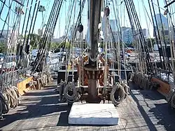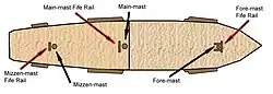 A fife rail is a design element of a European-style sailing ship used to belay the ship's halyards at the base of a mast. When surrounding a mast, a fife rail is sometimes referred to specifically by the name of the mast with which it is associated: the main fife rail surrounds the main mast; the mizzen fife rail surrounds the mizzen mast, etc. It is one of a dozen or so types of "rails" often found on such ships.[1] Fife rails are typically horizontal strips of either wood or iron and are joined and fitted to the tops of a series of stanchions. The term apparently derives from the location where the ship's fifer would sit and play his fife at heaving of the ship's anchor.[2]