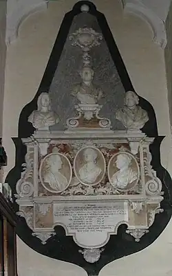The Parish Church, dedicated to St. Mary Magdalene after whom the village is named, dates mostly from the 14th century. However its most striking feature is the small "Newman chapel" built onto the north side of the nave sometime around 1693. It is believed to cover a vault containing the mortal remains of several members of the Newman family who were Lords there for many centuries. At first the family leased the Fifehead Tudor manor house from the Abbey of St Augustine's of Bristol, perhaps since 1408, but then bought the estate in the early 15th century.[7] The chapel was almost certainly commissioned by Col. Richard Newman (1620–1695) whose father Richard (1584–1664) and grandfather Thomas (d.1649) are memorialised on plaques mounted on the chapel's east wall, and whose son Richard (1650–1682) who predeceased him, is memorialised on the west wall.[8]
