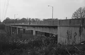 The second Fifth Street Viaduct was a reinforced concrete bridge built in 1933 to allow for automobile, streetcar, and pedestrian travel between the neighborhoods of Highland Park and Jackson Ward. The design was drafted by Alfredo C. Janni and the bridge was built by the Richmond Bridge Corporation.[1]: p.13 The 1,185-foot (360 m) bridge consisted of seven double-span rigid frames supported on expansion piers and stiff towers[1]: p.1, 2 and was one of five Richmond bridges built during 1933-34 in a major public works program sponsored by the Richmond Bridge Corporation in conjunction with local authorities[1]: p.2