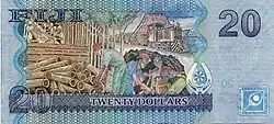 $20 146 × 67 mm Blue Foa; domodomo (canoe masthead) as registration device; Queen Elizabeth II; Fijian coat of arms Fish processing; cutting lumber; mining; train; Mount Uluinabukelevu 2007[9] 10 April 2007 Fijian head and electrotype 20
