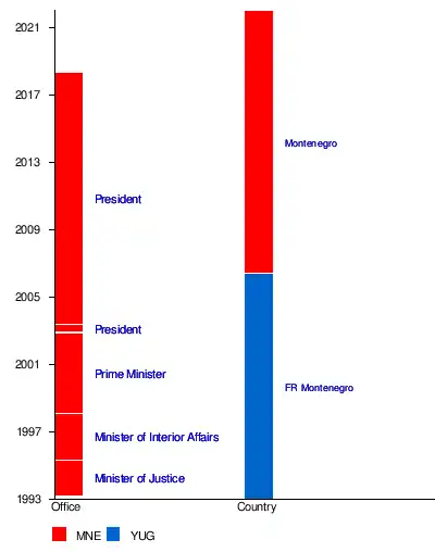 The chart below shows a timeline of the offices held by Vujanović and the Montenegro status. The left bar shows the president and all prime minister's terms of Vujanović, and the right bar shows the country status of Montenegro at that time.