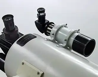 A finderscope is an accessory sighting device used in astronomy and stargazing, typically a small auxiliary refracting telescope/monocular mounted parallelly on a larger astronomical telescope along the same line of sight. The finderscope usually has a much smaller magnification than the main telescope, thus providing a larger field of view, useful for manually pointing (a.k.a. "slewing") the main telescope into a roughly correct direction that can easily place a desired astronomical object in view when zooming in. Some finderscopes have sophisticated reticles to more accurately aim the main telescope and/or even perform stadiametric measurements.