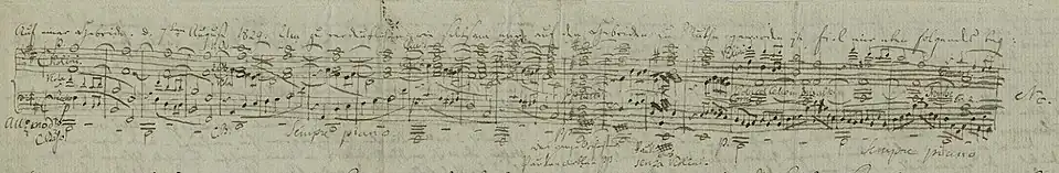 Mendelssohn first visited England in 1829 following invitations from Sir George Smart and the Philharmonic Society.[5] Following his tour of England, Mendelssohn proceeded to Scotland, where he began work on his Symphony No. 3, Scottish.[6] He was engaged on a tour of Scotland with his travelling companion Karl Klingemann when he sent a letter to his family with the opening phrase of the overture written on it. In a note to his sister Fanny, he said: "In order to make you understand how extraordinarily the Hebrides affected me, I send you the following, which came into my head there."[7] The cave at that time was approximately 35 feet (11 m) high and over 200 feet (61 m) deep, and contained black basalt pillars.[7]