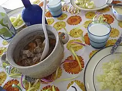 The most popular meats in Finland are pork (33.5 kg/year/person in 2005), beef (18.6 kg), and chicken (13.3 kg).[6] Approximately one third of this is eaten as sausage (makkara), which is mostly made from pork but often mixes in other meats as well.[7] Horse meat, lamb and reindeer make up a small portion of the total meat consumption, but they are widely available.[8]