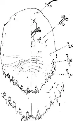 The adult female of Fiorinia externa is about 1 mm long. The scale cover of the second instar female is elongated, around 1.5 mm long and has a yellowish-brown, orange-brown or reddish-brown colour. The scale cover of immature males is white. The eggs and crawlers are yellowish and when the crawlers settle, they excrete white wax filaments which may be abundant and give the infested hemlock leaves a whitish appearance.[5][6]