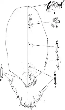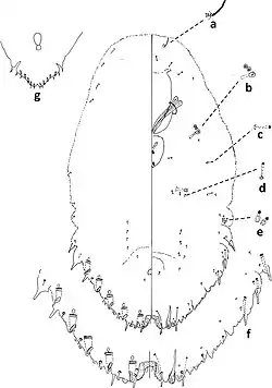 | Fiorinia phantasma 2nd instar female - a) antenna; b) anterior spiracle c) microduct with sclerotized orifice; g) old second-instar female. | |