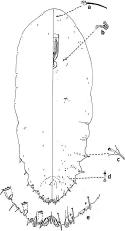 | Fiorinia theae 2nd instar female - a) antenna; b) anterior spiracle c) large gland spine; d) small microduct; e) enlargement of pygidium. | |