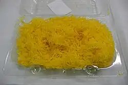 Through Portuguese trade and colonization, the dish has spread to many countries in Asia.[2] In Japan, it is known as keiran sōmen[3] (鶏卵素麺, lit. 'hen egg noodles'), in Cambodia as vawee[4] (Khmer: វ៉ោយ), in Malaysia as jala mas (lit. 'golden net'),[5] in Thailand as foi thong (Thai: ฝอยทอง; lit. 'golden strand'),[6] and in the Malabar region of Kerala, India as muttamala (മുട്ടമാല; lit. 'egg chain' or 'egg necklace').[7] This dish is called letria in Goa.[8] Fios de ovos is also popular in Brazil, as well as Spain, where it is known as huevo hilado. In Seville, it is shaped into peaked cones called yemas de San Leandro.[2]