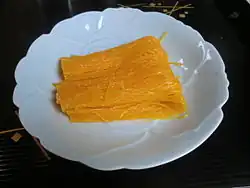 In Portugal and Brazil, fios de ovos are often used in fillings such as pão de rala, cake decorations and other desserts and accompaniments for sweet dishes. In Brazil, they are also used as accompaniments in savory dishes, often served with canned fruits alongside Christmas turkey.[14][15] In Japan, they are served in the form of dessert rolls (wagashi),[16] and known as keiran sōmen (鶏卵素麺; egg yolk thin noodles).[3]