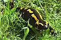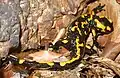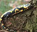 It is black with yellow spots or stripes to a varying degree; some specimens can be nearly completely black while on others the yellow is dominant. Shades of red and orange may sometimes appear, either replacing or mixing with the yellow according to subspecies.[2] This bright coloration is highly conspicuous and acts to deter predators by honest signalling of its toxicity (aposematism).[3] Fire salamanders can have a very long lifespan; one specimen lived for more than 50 years in Museum Koenig, a German natural history museum.