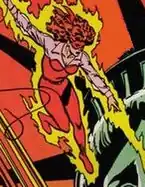 Volcanologist Danette Reilly is the sister of Rod Reilly, the first Firebrand. First introduced in a special "All-Star Squadron" preview in Justice League of America #193 (August 1981), Danette was studying volcanos north of Hawaii when she was kidnapped by the time-travelling villain Per Degaton and the sorcerer Wotan. During her escape, Wotan hit her with a magical blast and hurled her into a pit of lava. The combination of his magic and the lava not only allowed her to survive, but gave her the power to control heat and project fire blasts . Her powers surfaced after she discovered her brother Rod's costume and put it on. As Rod had been injured during the attack, Danette decided to become the new Firebrand.[8] Due to Degaton going back to future when he was defeated, the All-Star Squadron forgot his attack. Originally, she was quite racist towards the Japanese, but she visited her brother in hospital and he revealed he had been saved from death by a soldier whose parents were from Japan, and who later died from his wounds. Firebrand realized she had been racist and would show more respect towards those from Japan.