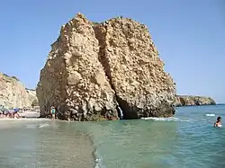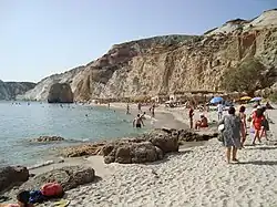 Firiplaka or Firiplaka Beach is a beach situated at the southern side in Milos Island, Greece between the other beaches of Provatas (West) and Tsigrado (East). It is one of the most popular beach on the island. The beach is extensive with majestic towering volcanic cliffs, snow-grey fine sand and white pebbles and shallow turquoise waters. There are umbrellas and sunbeds and a bar hut. There is also a huge rock with a cave under it in the water near the shore and it was sculptured out from a volcanic a long time ago. The access to the beach is possible by your own vehicle, taxi, bus or even boat which goes around the island from the port of Adamas. The largest part of the road is asphalt, however the last part of it, is a gravel paved driveway.