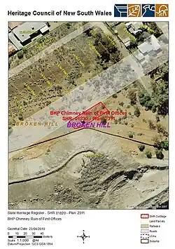The First BHP Offices Chimney Ruin is the heritage-listed ruin of the original offices of BHP in Broken Hill in the far west of New South Wales, Australia. The original offices were built in 1885 by Tom Phin and A. W. B. Orman on what is now known as Willyama Common, east of the corner of Gaffney and Oxide Streets in Proprietary Square. The property is owned by Broken Hill City Council. It was added to the New South Wales State Heritage Register on 23 April 2010. This heritage listing also refers to it as the Site of first BHP Offices, BHP Fireplaces and Chimney ruins.[1]