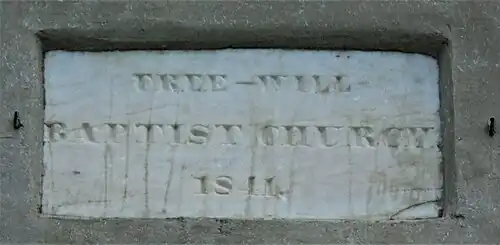 Marble plaque on the church's facade showing it was initially called the "Free-Will Baptist Church".