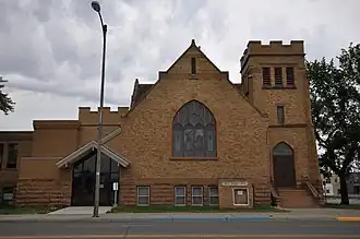 The First Methodist Episcopal Church and Parsonage, now the United Methodist Church in Glendive, Montana, was listed on the National Register of Historic Places in 1988.[1] The church building was built in 1909; the parsonage in 1913. They are located at 209 N. Kendrick. The parsonage is a Bungalow/Craftsman architecture house. The church is Late Gothic Revival, or English Gothic architecture in style, designed by Miles City-based architect Brynjulf Rivenes.[2]