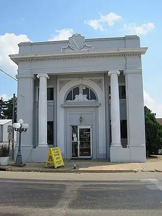 The First National Bank Building is a historic bank building at 207 West Drew Avenue in the center of Monette, Arkansas. It is a two-story Classical Revival, built of load-bearing brick and sculptured stone in 1918, and is the most architecturally significant building in the small town. The main facade is distinguished by two large Doric columns, which frame a portico area sheltering the main entrance. The entrance, now a modern glass doorway, is framed by a molded square arch which supports a dentillated entablature. This assembly is itself framed by a more monumental round-arched molding with keystone.[2]