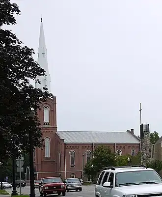 The church was designed in the Romanesque Revival style, and is the largest such church in Branch County. The red brick building is rectangular with a gable roof and a projecting, centrally aligned tower. A sandstone belt course divides the largely-above-ground basement from the sanctuary. The steeple, which stands 185 feet (56 m) tall, is a major landmark in Coldwater and is one of the tallest in southern Michigan. It is covered with white shingles and features two sets of narrow gabled dormers. The belfry houses a bell manufactured in 1853 by the Meneely Bell Foundry of West Troy, New York. The sanctuary's stained and painted glass windows were installed in 1868, created by George A. Misch and Brothers of Chicago.[2]