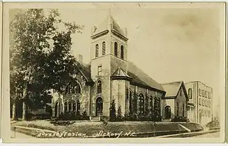 First Presbyterian Church is a historic Presbyterian church located at 2nd Street and 3rd Avenue NW in Hickory, Catawba County, North Carolina. The church began in 1873 as a small mission church in the village of Hickory Station.[2] Construction of the current building took place between 1905 and 1906, and it features a Romanesque Revival architectural style with a granite exterior. The front facade features square towers of unequal height. Attached to the church in 1928, is a three-story granite block Education Building with a flat roof and crenelated cornice. Also on the property is the former manse; a two-story, American Foursquare dwelling with a low hipped roof, overhanging eaves, and hipped dormer.[3]