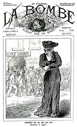 On 1 June 1879, a Liberal majority under Walthère Frère-Orban succeeded in passing an Education Act secularizing primary education. Frère-Orban, who was well known for his anti-clerical beliefs, was nicknamed the "Papist Biter" (Papenvreter). New "neutral" schools were to be established in all municipalities, funded by the local communes with assistance from national government, while Catholic schools were to receive no support at all.[2] The Church encouraged a boycott of the new schools. By 1883, although 3,885 secular schools had opened across the country, attendance in private Catholic schools had actually risen from 13 percent to over 60 percent.[4]
