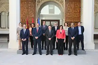 Aside from the president and his ministers, the director of the Woman Institute Araceli Martínez and the spokesperson Nacho Hernando (without rank of regional minister) also meet at the council of government.[4] The members of the cabinet served in acting capacity since the May 2019 regional election until the formation a new government presided again by García-Page in July 2019.