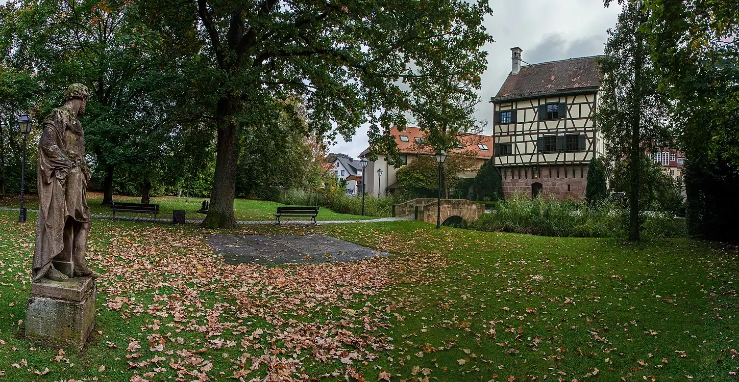 The “Pellerschloss”, Pellergasse 3a, is one of the few examples of a typical 16th century mansion that has been preserved in its structural integrity. Two protruding half-timbered upper floors with a gable roof and dwarf hip rest on a stone base with only embrasures, and slanted support beams emphasize the expansive superstructure. The choir was planned into the wooden structure. Above the arched entrance on the north side is the coat of arms of the Peller von Schoppershof patrician family, which died out in 1870 and owned the castle from 1687. It was once surrounded by a moat that has now been filled in. It belonged to a number of patrician families over time. Today it belongs to the city of Nuremberg; Wedding ceremonies are held in the ground floor hall and the rooms can be rented for events.