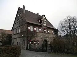 Fischbach was first mentioned in a document in 1339 with the name “Fischpekken”. Fischbach was created by imperial ministerials as part of the development of the Nuremberg Reichswald (de), the imperial forest around Nuremberg, as a place for honey hunting (in Franconia Zeidelgut). The “Vischebekken von Vischebach”, first mentioned in 1330, were granted to burgmanns of the burgraves of Nuremberg as fiefedoms from 1339.[5] Around 1350 they became over-indebted and had to sell their possessions to the imperial city. Their likely seat was probably at the location of the Harsdorf's Mansion (see Harsdorfsche Schloss below).
