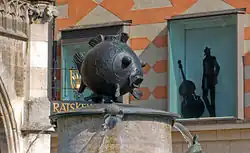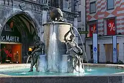 The fountain now consists of a Nagelfluh basin, whose central column is crowned by a bronze fish from Henselmann's pupil Otto Kallenbach.[1] This fish is reminiscent of the time when the Marienplatz still served as a central market place and the fishmonger hung their still living goods in baskets in the fresh fountain water. The three butchers let their buckets pour water into the basin, therefore the figure group plays on the "Metzgerprung" (see below).