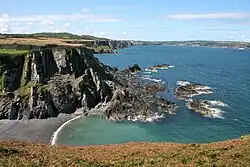 Fishguard Bay (Welsh: Bae Abergwaun) is a bay on the north Pembrokeshire coast, Wales. It opens north into Cardigan Bay and features rugged cliffs, tiny coves and the sheltered Fishguard Harbour and port of Lower Fishguard. Ferries from Fishguard cross to Ireland, and numerous activities are carried out in this holiday area.