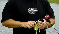 The fishing lure is either directly tied to a fishing line (usually a leader) by a knot such as the improved clinch knot or the Palomar knot, or linked to the line via a small split ring (which allows more freedom of motion) and/or a tiny safety pin-like fastener called a "snap", which is usually also connected to a swivel. The fishing line is in turn connected to a fishing reel which cranks in and releases out the line, and is manipulated by the fishing rod via a series of ring guides that impart lateral displacement on the line.