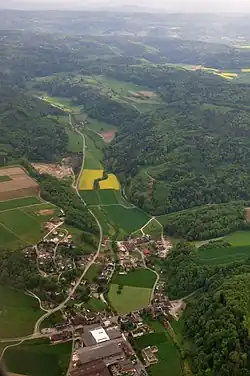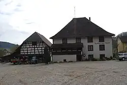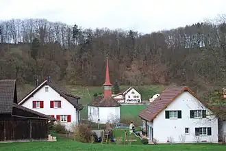 While some scattered items from the Bronze Age were discovered in Fisibach, the first evidence of a settlement is a Roman era watchtower along the Rhine River. The modern village of Fisibach is first mentioned in 1050 as Fusibach.[3] The owners of Waldhausen Castle in the hamlet of Waldhausen, granted St. Blaise's Abbey extensive landholdings around their castle in 1113. However, by the 15th century, the castle was abandoned. On a rock in the Rhine was the Schwarzwasserstelz Castle. This castle, after 1363, was in the possession of the Bishop of Constance, and from 1589 to 1831 in the hands of the Tschudi family of Glarus. In 1875 it was demolished during the construction of the Rhine Valley Railway. The railroad did not have a station in Fisibach. The owner of Schwarzwasserstelz held the low court rights over Fisibach, while the Vogt of Baden held those rights in Waldhausen and Hägelen.[3]