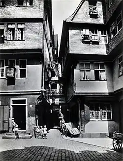 The appearance of the Five-Finger Square was unique for Frankfurt as well as in comparison with other medieval half-timbered towns. It was the central convergence point of several small streets; Schwertfegergässchen, Drachengässchen, Goldhutgasse and Flößergasse.[1]