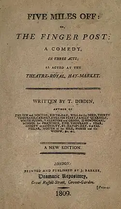 Five Miles Off is an 1806 comedy play by the British writer Thomas Dibdin. It premiered at the Theatre Royal, Haymarket in London on 9 July 1806.[1] The original cast included William Chapman as Squire Flail, John Fawcett as Kalendar, Vincent De Camp as Luckless, Charles Mathews as Spriggins, John Liston as Flourish, Jane Powell as Mrs Prue, Sarah Liston as Laura Luckless, and Maria Gibbs as Jenny. Its Irish premiere took place at the Crow Street Theatre in Dublin on 2 August 1816[2]