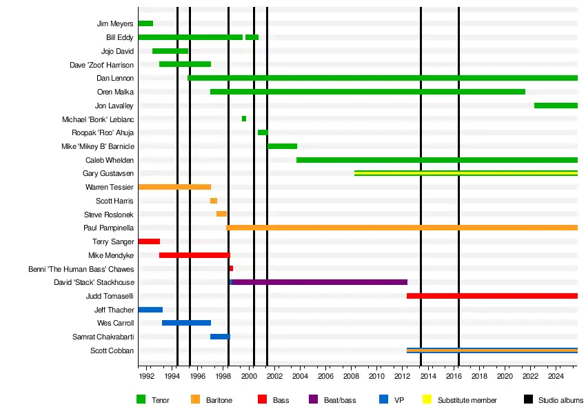 - Mike Mendyke - bass (1993-1998), currently with the vocal band Dick Van Dyke and The Vantastix