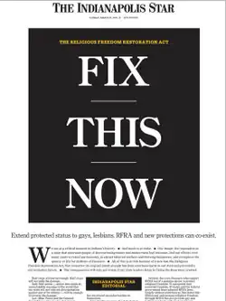"Fix This Now" was the front-page headline for The Indianapolis Star on March 31, 2015, referencing the newly passed "Religious Freedom" law that many said could allow businesses to deny serving LGBT couples on the basis of religious obligations.[1]
