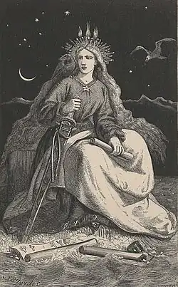 The personification of a nation as a woman was widespread in eighteenth- and nineteenth-century Europe.[1] The earliest image of Iceland personified as a woman seems to have appeared first in association with the poem Ofsjónir við jarðarför Lovísu drottningar 1752 ('Visions at the funeral of Queen Louise, 1752') by Eggert Ólafsson (1752), but this image does not survive.[1]