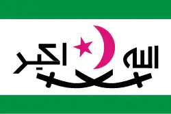 1990s | 2:3 | Ingush separatists | Flag used by Ingush separatists, consists of three horizontal stripes: a white stripe in the middle and two green stripes at the top and bottom; in the center a red crescent and star is located in the middle and 2 swords below it, and a "الله أكبر" on the sides. |