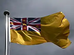 The flag of Niue was adopted on 15 October 1975. It consists of the Union Jack in the upper left corner with a star in the middle of the Union Jack and four stars forming a diamond around it. It is very unusual for a flag based on a British ensign design, in having not only a yellow background, but also a defaced Union Jack in the canton.[1] It was designed by Patricia Rex, the wife of the then-Premier Robert Rex.[2]