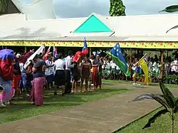 From the Niue Flag Act 1975: "The Niue National Flag shall be a golden yellow flag, bearing on the upper canton of the hoist there of the Union Flag, commonly known as the Union Jack, displaying 2 five-pointed yellow stars on the vertical line and on the horizontal line thereof separated by a blue disc containing a larger five-pointed yellow star."[3] In 2023, it was noted that a number of funerals for former Members of Parliament were using flags that did not follow the prescribed colours in the Niue Flag Act. The government of Niue responded to state that they were going to address the issue.[4]
