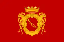 The state flag of the city includes the coat of arms placed in the centre. It consists of the yellow (golden) Greek cross near the top left corner, and to its right, the yellow (golden) letters SPQR (an abbreviation for Senatus Populusque Romanus, which translates from Latin to The Roman Senate and People), placed diagonally, from top left to bottom right, across the red Heater-style escutcheon (shield) with square top and pointed base. On the top of the shield is placed a yellow (golden) open crown, crown with five flowers, and with red, white, and green jewels.[1][2]